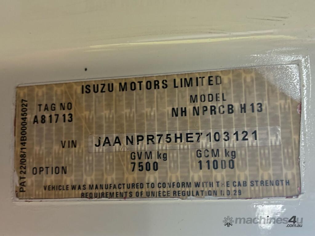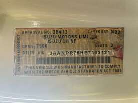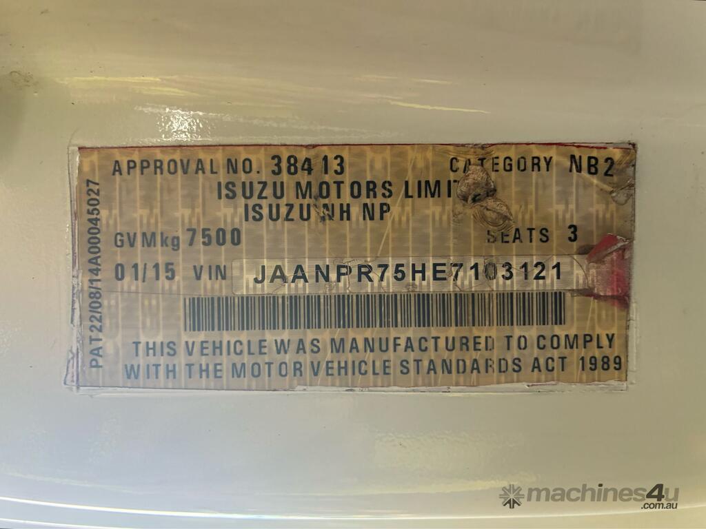 CP: 01/2015,Isuzu,NPR,Cab Chassis,Manual,Spring,4 Cyl,Diesel,312102 (Kms. Showing on Odometer),Hourmeter not visible,Colour: White,Rego. No: 1EQ1VW QLD,VIN: JAANPR75HE7103121,Key No: 138,GVM: 7500,GCM: 11000,Sold with No Plates,Key No: 138