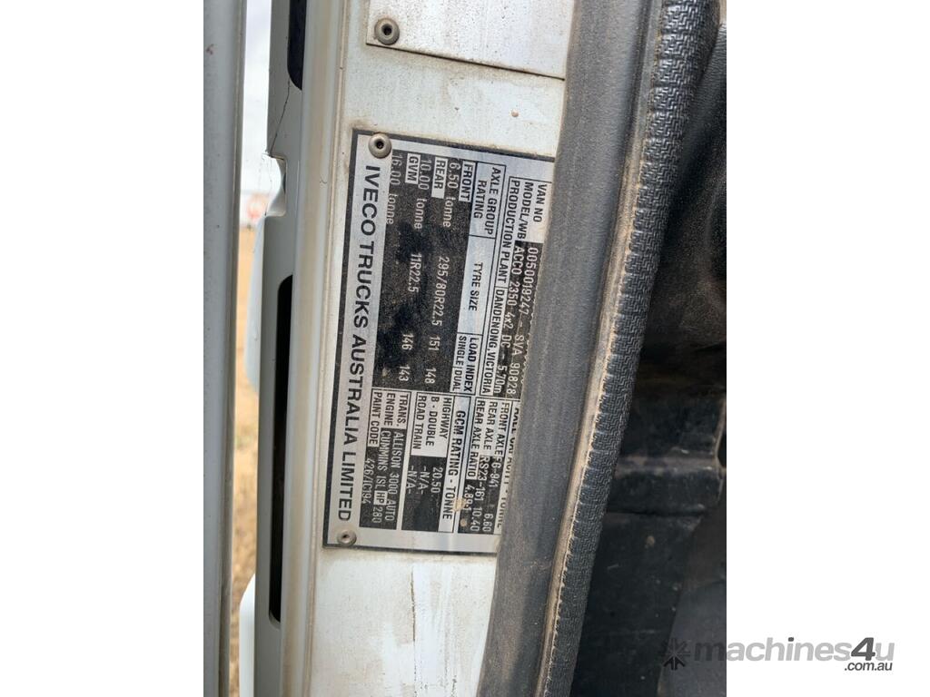 CP: 11/2015,Iveco,ACCO,Cab Chassis,Automatic,Airbag Suspension,Cummins,Odometer not visible,Hourmeter not visible,Unregistered,VIN: 6F2222300FDY00310,GVM: 16000,GCM: 20500,Sold with No Plates,WOVR Status: WOVR N/A,Incident Type: Not Applicable