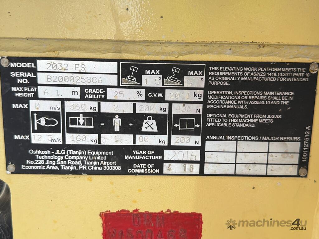CP: CIRCA 2015,Built: 01/2015,JLG,2032ES,Scissor Lift,Battery,Odometer not visible,194 (Hrs. Showing on Hour meter),Colour: Orange,Unregistered,Serial No: B,Sold with No Plates