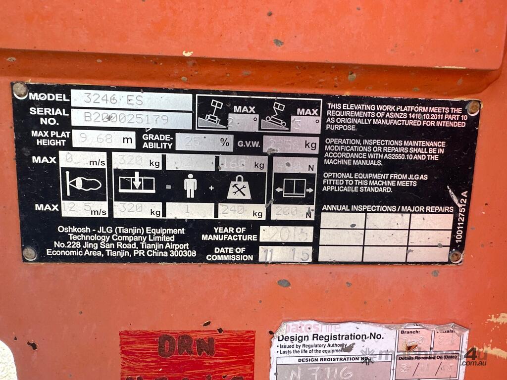 CP: CIRCA 2015,JLG,3246ES,Scissor Lift (Electric),Electric,Odometer not visible,34 (Hrs. Showing on Hour meter),Colour: Orange,Unregistered,Serial No: B,Sold with No Plates,Key No: IN ASSET
