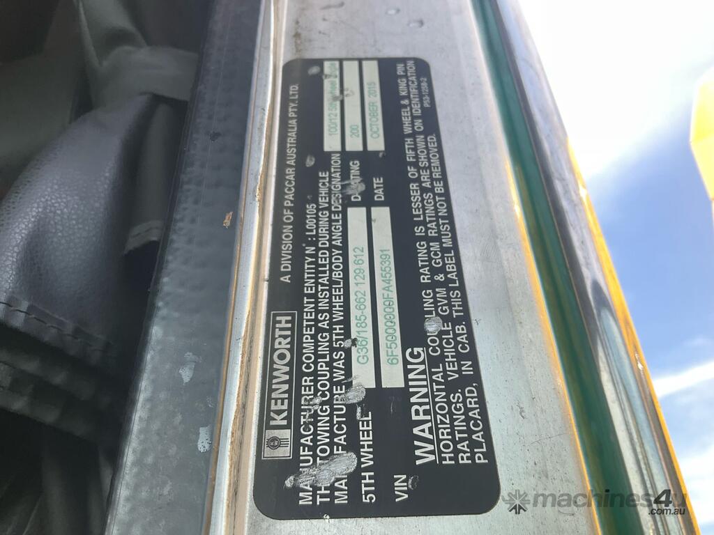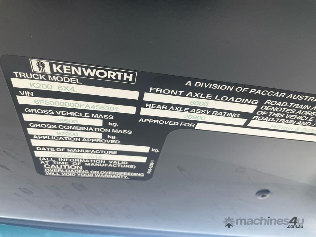 CP: 10/2015,Kenworth,K200 Series,Prime Mover Sleeper Cab,Automatic,Airbag,Engine #: 79861959,Cummins,6 Cyl,Diesel Turbo,234042 (Kms. Showing on Odometer),24237 (Hrs. Showing on Hour meter),Colour: Green,Rego. No: NP(XN13YN), Unregistered NAT,VIN: 6F5000000FA455391,Key No: 153,GVM: 26500,GCM: 97000,Sold with No Plates,Key No: 153