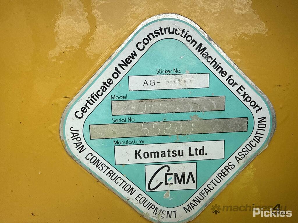 CP: CIRCA 2015,Built: 01/2015,Komatsu,GD655-5,Grader,6 Cyl,Diesel Turbo,Odometer not visible,10326 (Hrs. Showing on Hour meter),Colour: Yellow,Rego. No: 22808E NSW,Serial No: 55880,ROPS No: undefined,FOPS No: undefined,Sold with No Plates