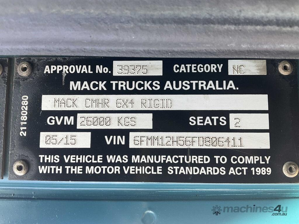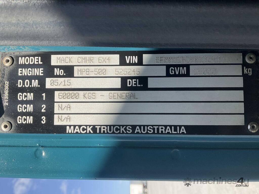 CP: 05/2015,Mack,CMHR Trident,Tipper,Automatic,Airbags ,Engine #: 525245,MP8,6 Cyl,Diesel Turbo,1062948 (Kms. Showing on Odometer),18322 (Hrs. Showing on Hour meter),Colour: Blue,Rego. No: NP(XP84MX), Unregistered NSW,VIN: 6FMM12H56FD806411,Key No: 547S,Length: 8 m,GVM: 26000,GCM: 60000,Sold with No Plates,Key No: 547S