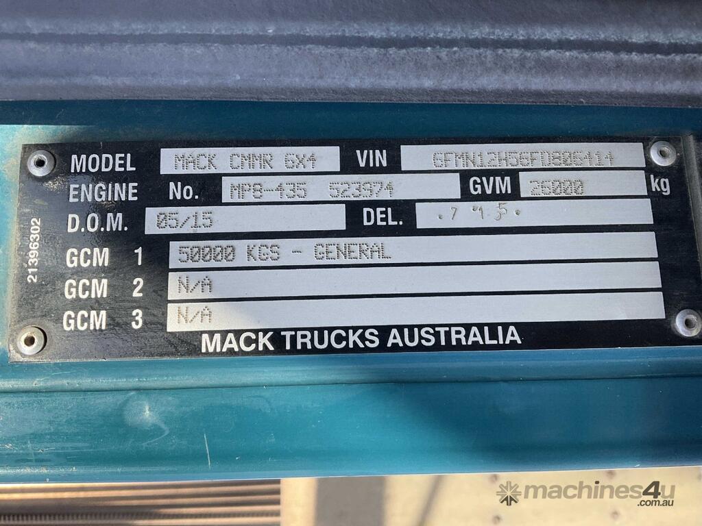 CP: 05/2015,Built: 05/2015,Mack,CMMR Granite,Tipper,Automatic,Airbags ,Engine #: 523974,MP8,6 Cyl,Diesel Turbo,778875 (Kms. Showing on Odometer),18673 (Hrs. Showing on Hour meter),Colour: Blue,Rego. No: NP(XO37KS), Unregistered NSW,VIN: 6FMN12H56FD806414,Key No: 472S,Length: 8.1 m,GVM: 26000,GCM: 50000,Sold with No Plates,Key No: 472S