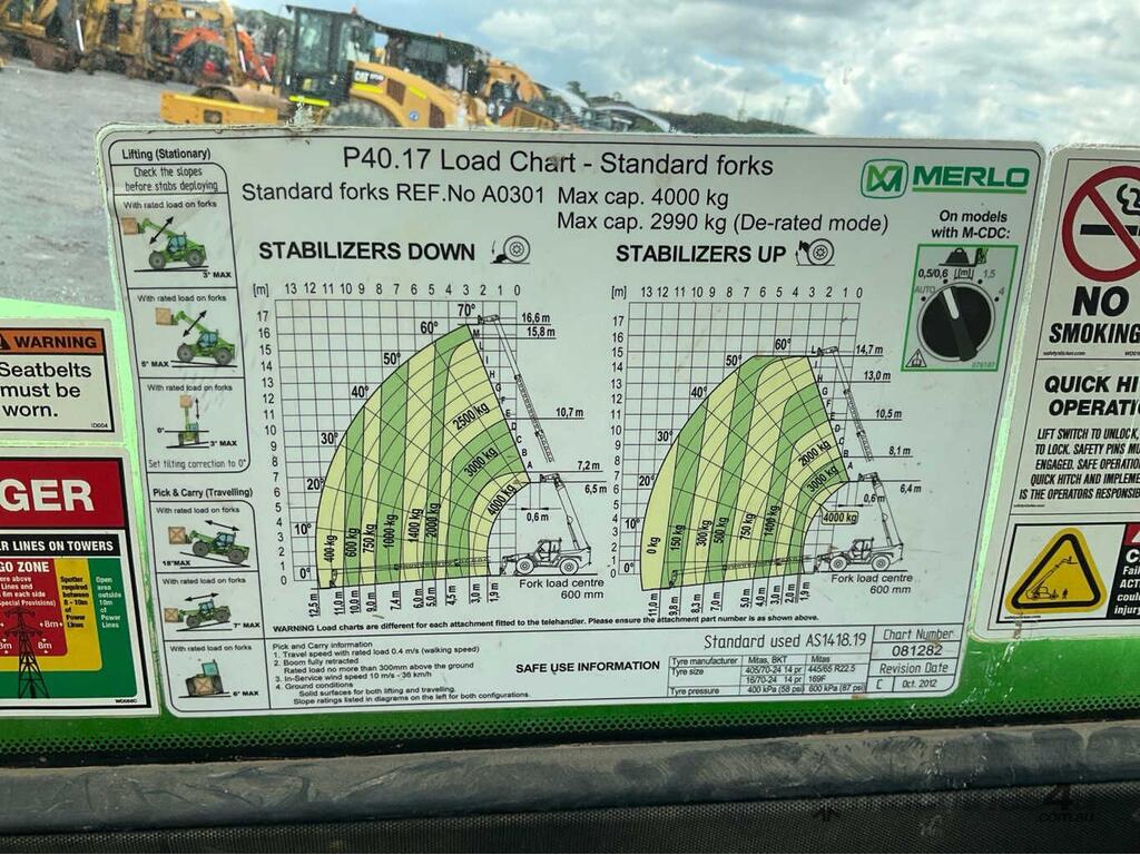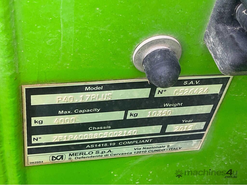 CP: CIRCA 2015,Merlo,P40.17 Plus,Telehandler,Engine #: 11585982,4 Cyl,Diesel Turbo,Odometer not visible,4184 (Hrs. Showing on Hour meter),Colour: Green,Unregistered,Serial No: ZF1P400B8C5002160,ROPS No: undefined,FOPS No: undefined,Sold with No Plates,Key No: 109E