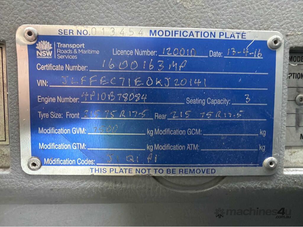 CP: 10/2015,Mitsubishi,FEC71 Canter 815,Crane Truck (Table Top),Automatic,Spring,Engine #: 4P10B78084,4 Cyl,Diesel Turbo,260523 (Kms. Showing on Odometer),Hourmeter not visible,Colour: White,Unregistered,VIN: JLFFEC71E0KJ20141,Key No: 567S,Length: 6.4 m,GVM: 7500,GCM: 11000,Sold with No Plates,Key No: 567S