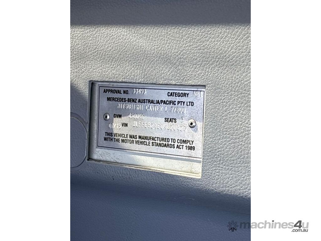 CP: 07/2015,Mitsubishi Fuso,Canter L7/800,Pantech,Manual,Diesel,Odometer not visible,Hourmeter not visible,Colour: White,Rego. No: NP(1EV2WD), Unregistered VIC,VIN: JLFFEB21E0KJ20427,Key No: 1,GVM: 4500,GCM: 8000,Sold with No Plates,WOVR Status: Statutory Write-Off,Incident Type: Impact,Key No: 1