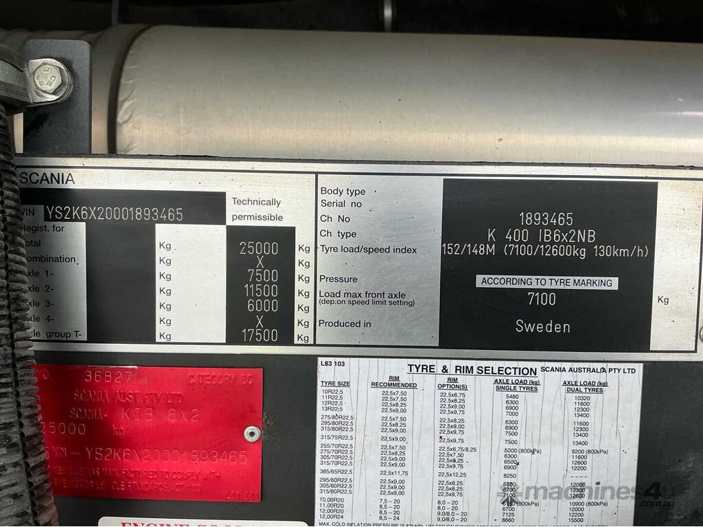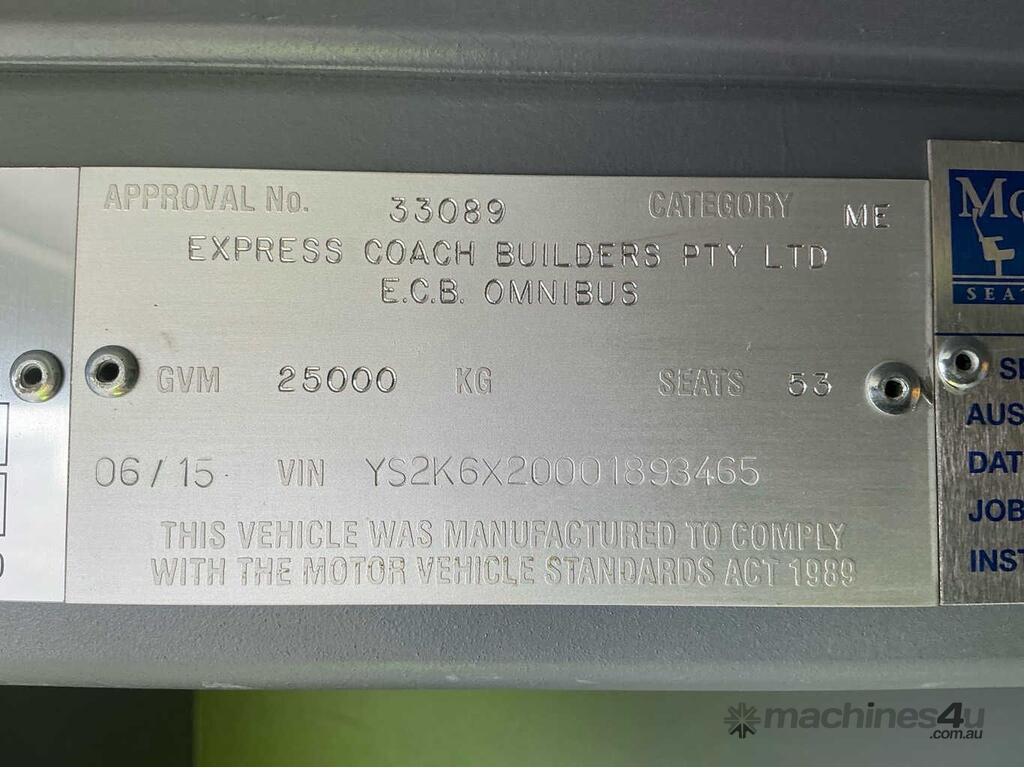 CP: 02/2015,Scania,K400 IB,Coach,Automatic,Spring,6 Cyl,Diesel Turbo,263050 (Kms. Showing on Odometer),4875 (Hrs. Showing on Hour meter),Colour: White,Rego. No: NP(D1545Q), Unregistered NSW,VIN: YS2K6X5,Key No: 594S,Length: 12.5 m,GVM: 25000,Sold with No Plates,Key No: 594S