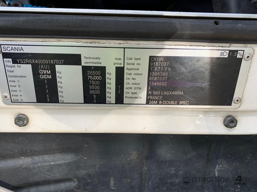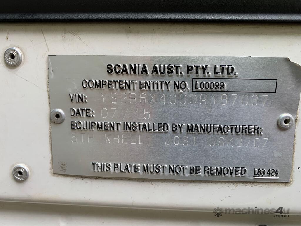 CP: 07/2015,Scania,R560,6x4 Prime Mover,Automatic,airbags,8 Cyl,Diesel,Odometer not visible,Hourmeter not visible,Colour: White,Rego. No: NP(MQT514), Unregistered,VIN: YS2R6X7,Length: 7 m,GVM: 26500,GCM: 75000,Sold with No Plates,WOVR Status: WOVR N/A