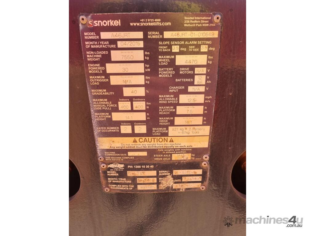 CP: 08/2015,Built: 04/2015,Snorkel,A46JRT,EWP,Diesel,Odometer not visible,1181 (Hrs. Showing on Hour meter),Colour: Orange,Unregistered WA,Serial No: A46JRT01010649,Sold with No Plates
