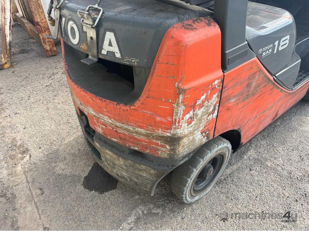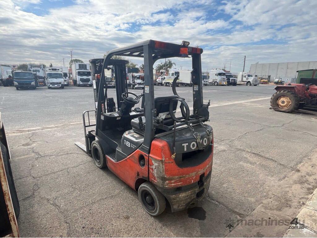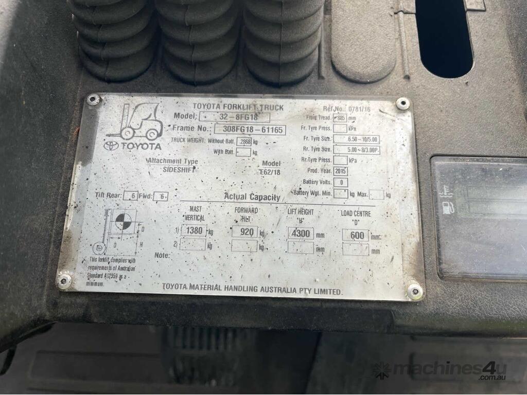 CP: CIRCA 2015,Built: 01/2015,Toyota,32-8FG18,Forklift,4 Cyl,Petrol & LPG (Dual),Odometer not visible,20262 (Hrs. Showing on Hour meter),Colour: Red,Unregistered,Serial No: 308FG18-61165,Sold with No Plates