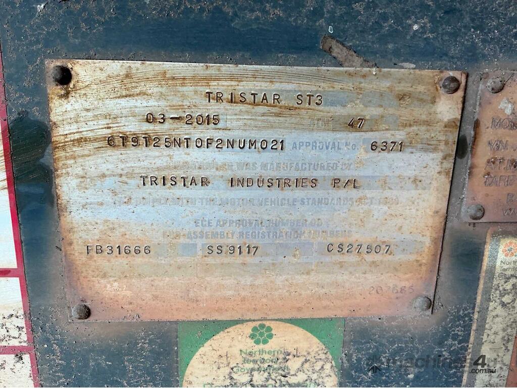 CP: CIRCA 2015,Built: 03/2015,Tristar,ST3,Tri Axle Side Tipper,Hubometer not visible,Colour: Yellow,Rego. No: NP(TJ7891), Unregistered NT,VIN: 6T9T25NT0F2NUM021,Sold with No Plates