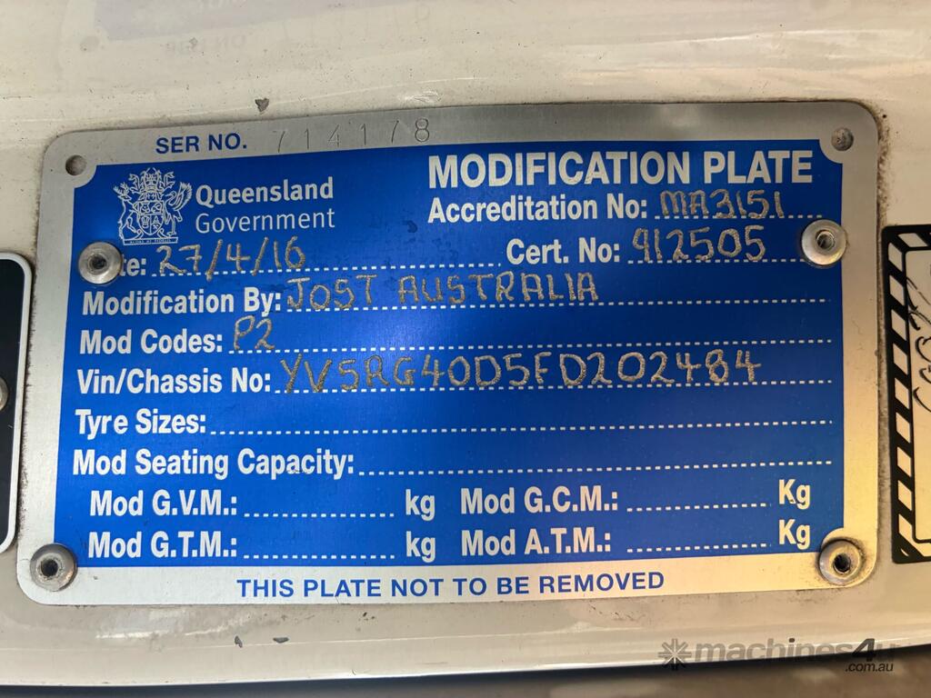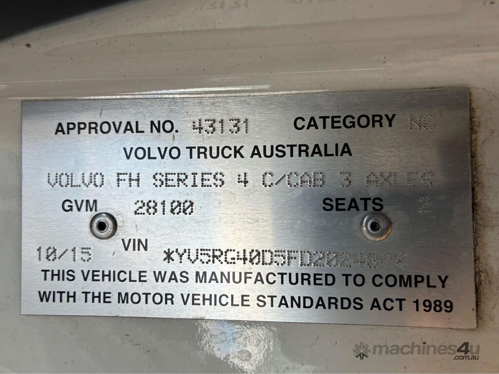 CP: 10/2015,Volvo,FH540,Prime Mover,Automatic,Airbag,6 Cyl,Diesel,1307632 (Kms. Showing on Odometer),Hourmeter not visible,Colour: White,Unregistered,VIN: YV5RG40D5FD202484,Key No: 365,GVM: 28100,GCM: 70000,Sold with No Plates,Key No: 365
