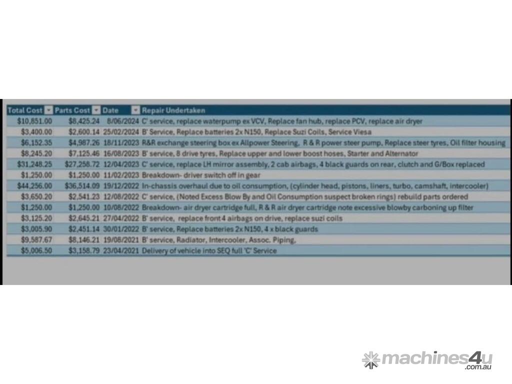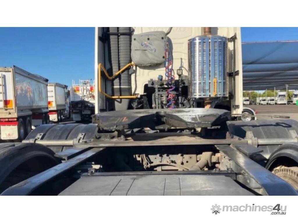 1.7m km - 350kms on rebuilt motor, Auto - ishift. 90 ton rated, 1360l fuel. Viesa bunk cooler. Super single steers. Drive tyres avg 60%. Underbunk fridge. No hydraulics. Maintenance and repair records.