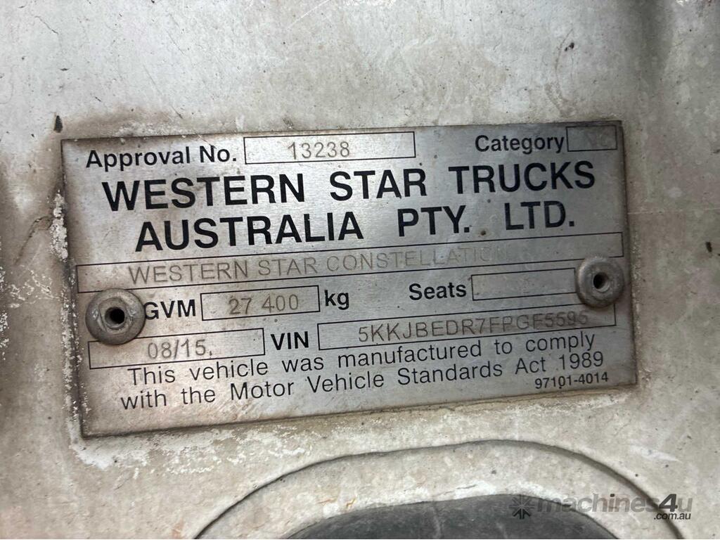 CP: 08/2015,Western Star,4800FX Constellation,Prime Mover,Manual,Airbag,DD15,6 Cyl,Diesel,18 Gears,816017 (Kms. Showing on Odometer),Hourmeter not visible,Colour: White,Unregistered,VIN: 5KKJBEDR7FPGF5595,Key No: 323,GVM: 27400,GCM: 106000,Sold with No Plates,Key No: 323