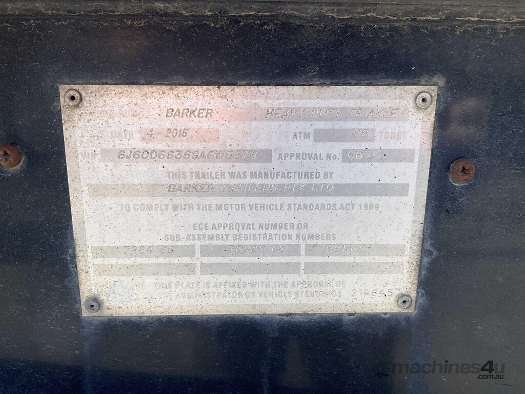 CP: 04/2016,Built: 04/2016,Barker,Heavy Duty Tri Axle,Tri Axle Skel Trailer,390396 (Kms. Showing on Hubometer),Colour: Black,Rego. No: TA49GN NSW,VIN: 6J6006636GAGW5576,Sold with No Plates