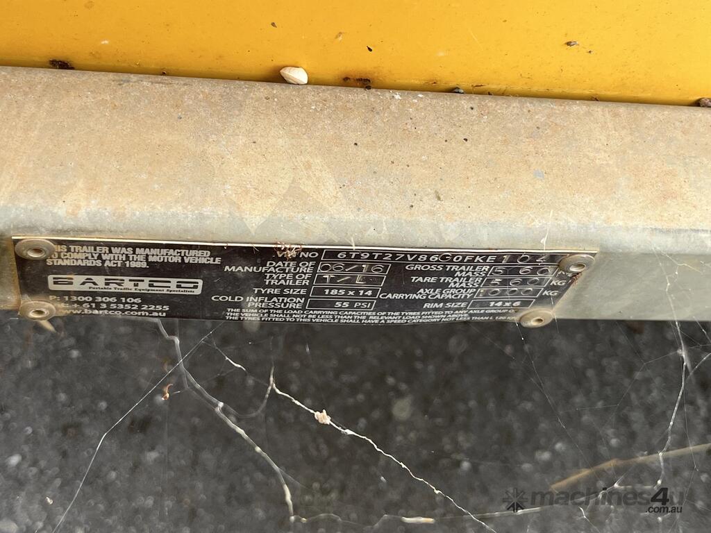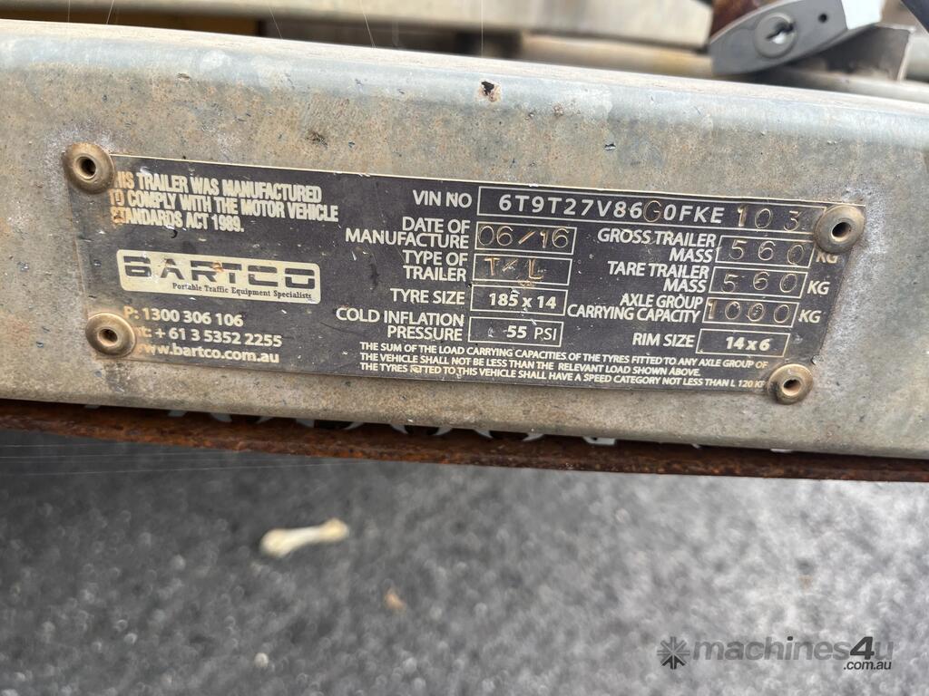 CP: 06/2016,Bartco,Single Axle Traffic Light Trailer Combination,Hubometer not visible,Colour: Yellow,Unregistered,VIN: 6T9T27V86G0FKE104,Sold with No Plates