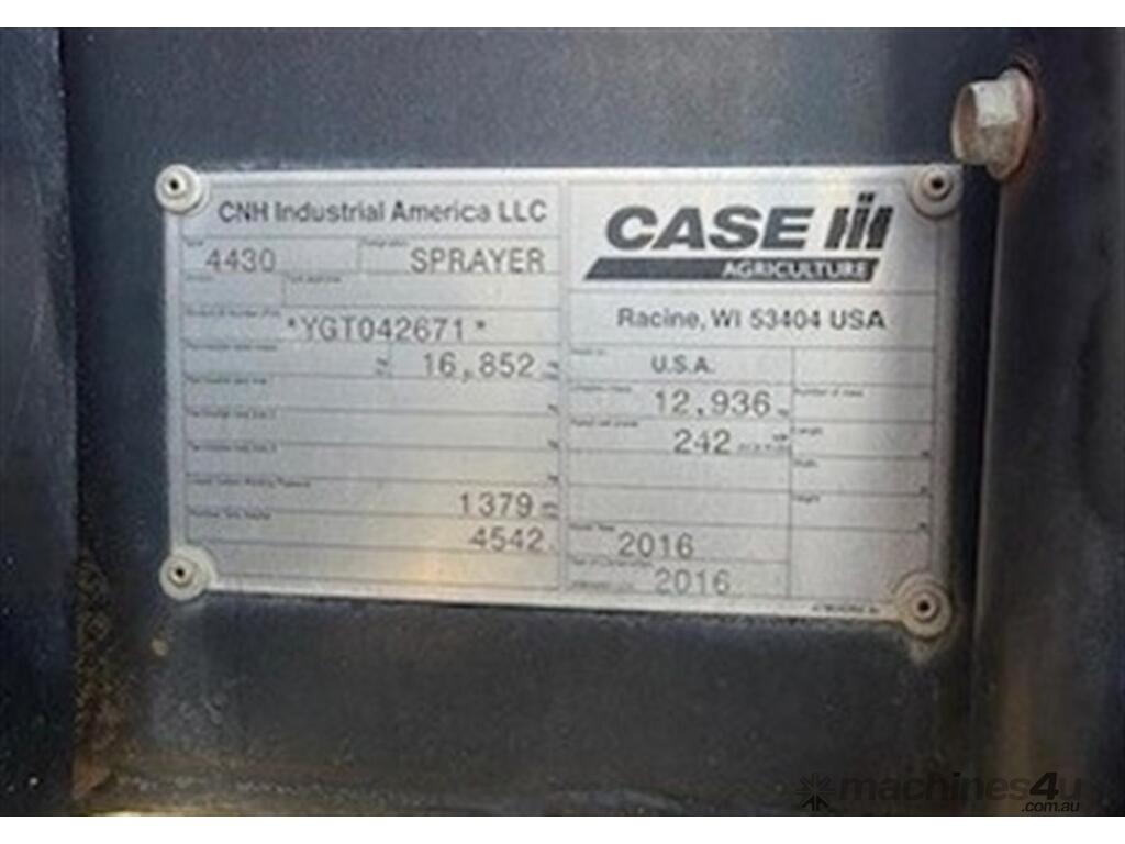 2016 Case IH 4430 Patriot Self Propelled Sprayer. 9,500hrs. 4500 litre tank, 36 metre boom, conentional spray system with 3 way nozzle bodies, 2016 Case IH 4430 Patriot Self Propelled Sprayer. 9,500hrs. 4500 litre tank, 36 metre boom, conventional spray system with 3-way nozzle bodies, 480/80R46 tyres all in excellent condition. Centrepoint Guidance, Auto Greaser, 9500 hours but in excellent condition for age. Located at Moree NSW. Contract Sandy Cosh on for more info.