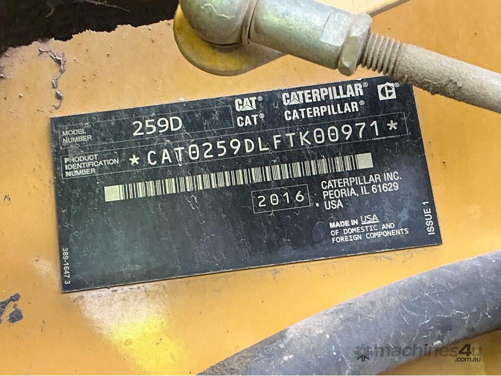 CP: CIRCA 2016,Caterpillar,259D,Skid Steer (Rubber Tracked),Diesel,Odometer not visible,9844 (Hrs. Showing on Hour meter),Colour: Yellow,Unregistered,VIN: CAT0259DLFTK00971,Serial No: NULL,Sold with No Plates,WOVR Status: WOVR N/A,Incident Type: Malicious