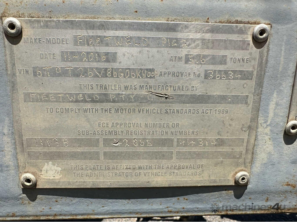 CP: 11/2016,Fleetweld,Pig 2,Dual Axle Plant Trailer,Hubometer not visible,Colour: Grey,Rego. No: NP(X64822), Unregistered VIC,VIN: 6T9T26V86G06KW002,Sold with No Plates,Key No: NO KEYS