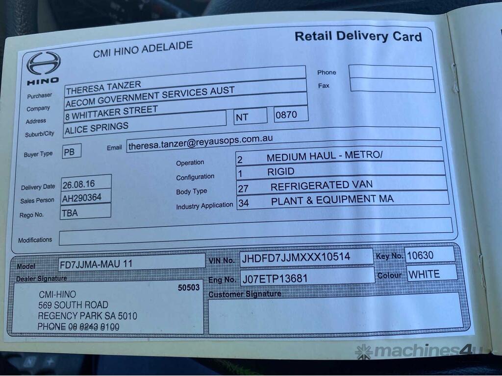 CP: 07/2016,Hino,FD500 1124,Refrigerated Pantech,Automatic,Spring,5 Cyl,Diesel,151337 (Kms. Showing on Odometer),Hourmeter not visible,Colour: White,Rego. No: CC38XM NT,VIN: JHDFD7JJMXXX10514,Length: 7.6 M,GVM: 11000,GCM: 16000,Sold with No Plates