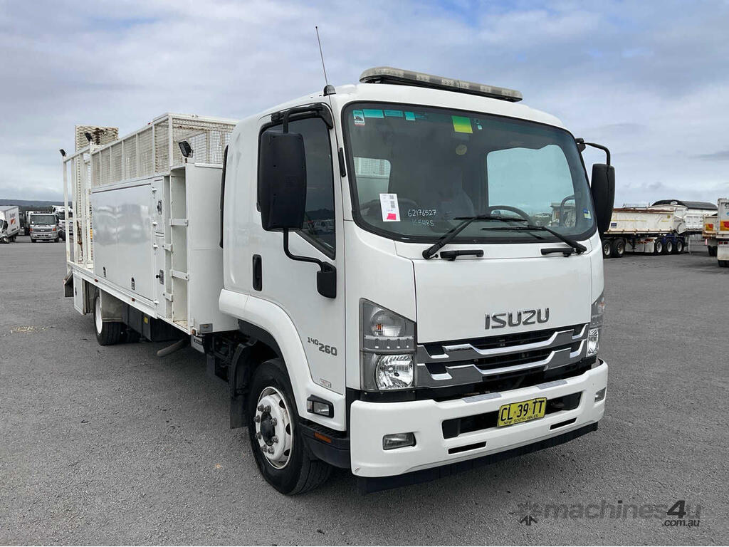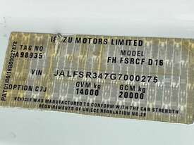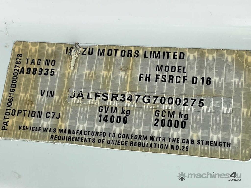 CP: 12/2016,Isuzu,FSR 140-260,Beaver Tail Service Body,Manual,Spring ,Engine #: 6HK1684811,6 Cyl,Diesel Turbo,6 Gears,131854 (Kms. Showing on Odometer),6482 (Hrs. Showing on Hour meter),Colour: White,Rego. No: NP(CL39TT), Unregistered NSW,VIN: JALFSR347G7000275,Key No: 548S,Length: 9.6 m,GVM: 14000,GCM: 20000,Sold with No Plates,Key No: 548S