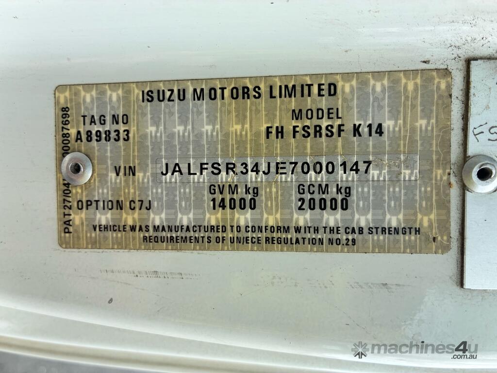 CP: 07/2016,Isuzu,FSR 850,Sweeper,Automatic,Spring,Diesel,231806 (Kms. Showing on Odometer),14336 (Hrs. Showing on Hour meter),Colour: White,Unregistered,VIN: JALFSR34JE7000147,Key No: 86,GVM: 14000,GCM: 20000,Sold with No Plates,Key No: 86