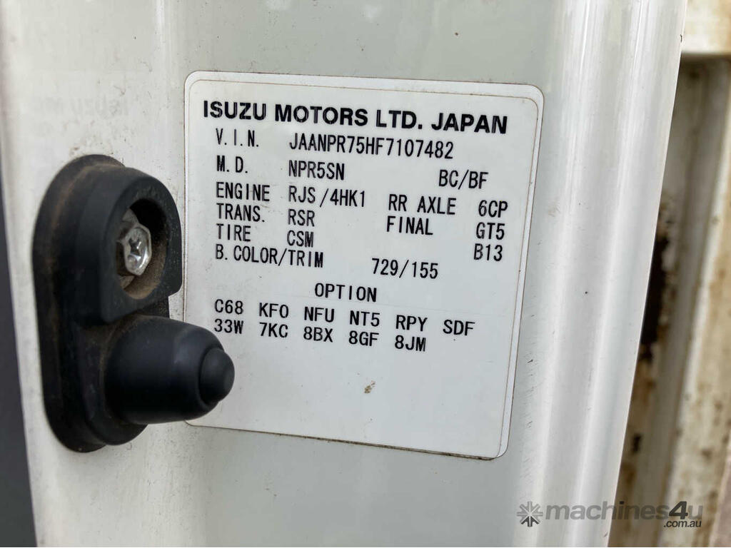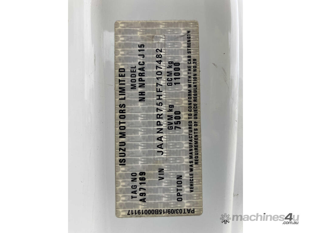 CP: 03/2016,Isuzu,NPR 75-190,Table Top,Automatic,Spring Suspension,4 Cyl,Diesel,226528 (Kms. Showing on Odometer),11248 (Hrs. Showing on Hour meter),Colour: White,Rego. No: CH77MN NSW,VIN: JAANPR75HF7107482,Length: 6.3 m,GVM: 7500,GCM: 11000,Sold with No Plates