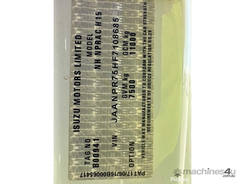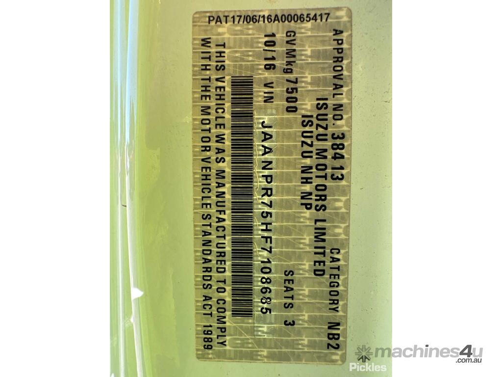CP: 10/2016,Isuzu,NPR 75-190,Table Top,Manual,Leaf Spring Suspension,Engine #: 507975,Isuzu 4HK1,4 Cyl,Diesel,Turbo,6 Gears,160212 (Kms. Showing on Odometer),Hourmeter not visible,Colour: White,Rego. No: NP(XO17ZV), Unregistered NSW,VIN: JAANPR75HF7108685,Key No: 74,Length: 6.5 m,GVM: 7500,GCM: 11000,Sold with No Plates,Key No: 74