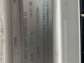 CP: 06/2016,Iveco,Daily 45 170,Table Top,Manual,Leaf Spring Suspension ,F1CFL411H,4 Cyl,Diesel Turbo,6 Gears,275558 (Kms. Showing on Odometer),Hourmeter not visible,Colour: White,Rego. No: NP(398XLP), Unregistered QLD,VIN: ZCFC145CX05051294,Length: 6.7 m,GVM: 4495,GCM: 8100,Sold with No Plates
