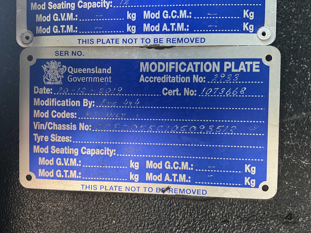 CP: 07/2016,Iveco,Daily 55-170,4x4 Offroad Tour Bus,Manual,Leaf Springs,Engine #: 2601479,F1CFL411F,Diesel,6 Gears,55803 (Kms. Showing on Odometer),Hourmeter not visible,Colour: White,Rego. No: NP(D2321F), Unregistered DEF,VIN: ZCFD055C,Length: 5.8 M,GVM: 5500,Sold with No Plates