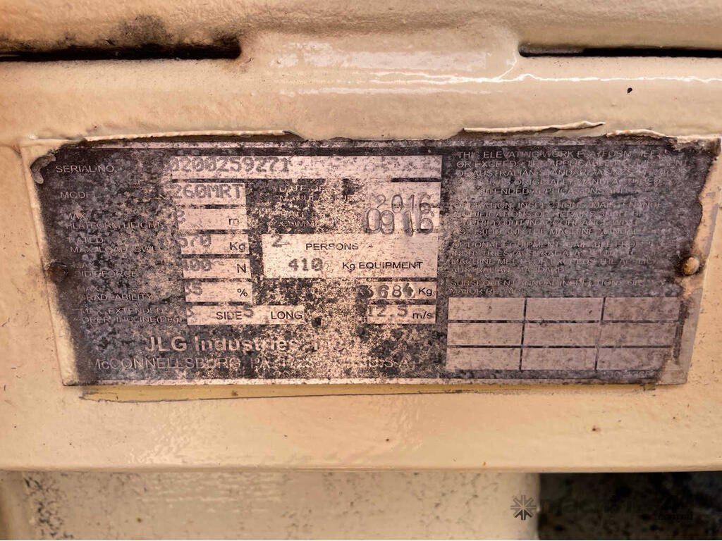 CP: CIRCA 2016,JLG,260MRT,Scissor Lift,Diesel,Odometer not visible,425 (Hrs. Showing on Hour meter),Unregistered QLD,Serial No: ,Sold with No Plates