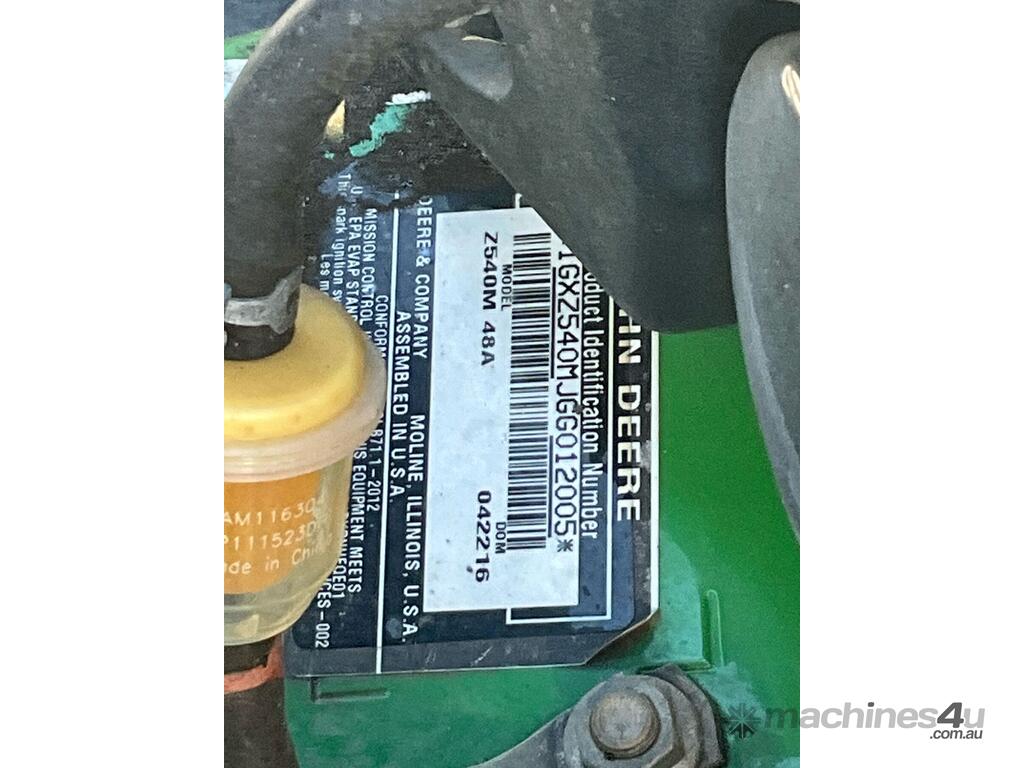 CP: CIRCA 2016,John Deere,ZTrak Z540m,Zero Turn Ride On Mower,2 Cyl,Petrol,Odometer not visible,1464 (Hrs. Showing on Hour meter),Colour: Green,Unregistered,Serial No: 1GXZ540MJGG012005,Sold with No Plates,Key No: 331E