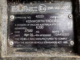 CP: 04/2016,Kenworth,K200 Series,Prime Mover Sleeper Cab,Manual,Airbag Suspension,Cummins,553646 (Kms. Showing on Odometer),22240 (Hrs. Showing on Hour meter),Colour: Blue,Rego. No: NP(XV64VY), Unregistered VIC,VIN: 6F5000000GA456383,GVM: 27500,GCM: 97000,Sold with No Plates
