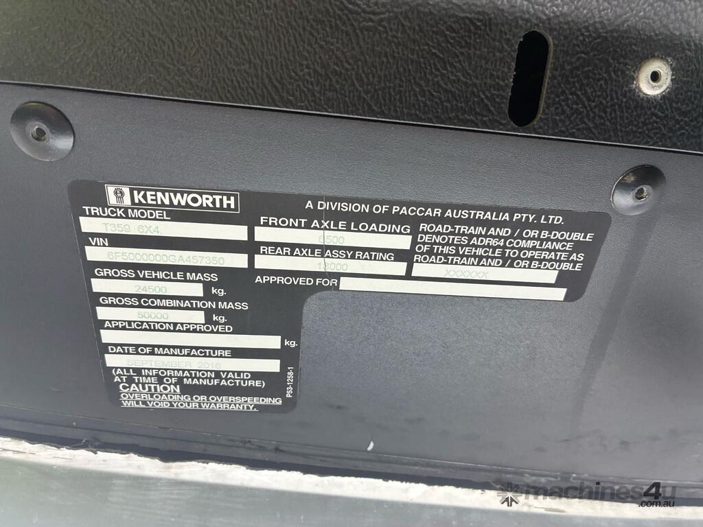 CP: 09/2016,Kenworth,T359,Prime Mover Sleeper Cab,Automatic,Airbag,6 Cyl,Diesel,927656 (Kms. Showing on Odometer),17596 (Hrs. Showing on Hour meter),Colour: Grey,Rego. No: NP(XB98BB), Unregistered NAT,VIN: 6F5000000GA457350,Key No: 377,GVM: 24500,GCM: 50000,Sold with No Plates,Key No: 377