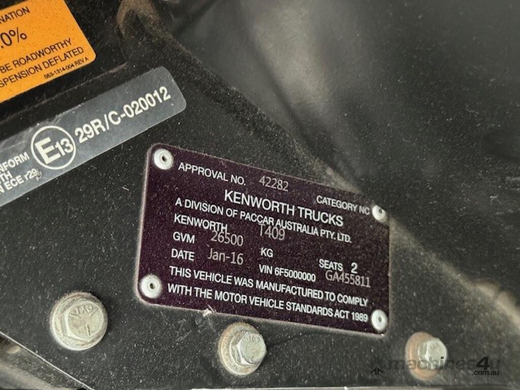 CP: 01/2016,Built: 01/2016,Kenworth,T409,Prime Mover,Airbag Suspension,Engine #: 80149331,Cummins,6 Cyl,Diesel,Intercooler Turbo,18 Gears,Odometer not visible,Hourmeter not visible,Colour: Brown,Rego. No: NP(ECC98), Unregistered QLD,VIN: 6F5000000GA455811,Sold with No Plates