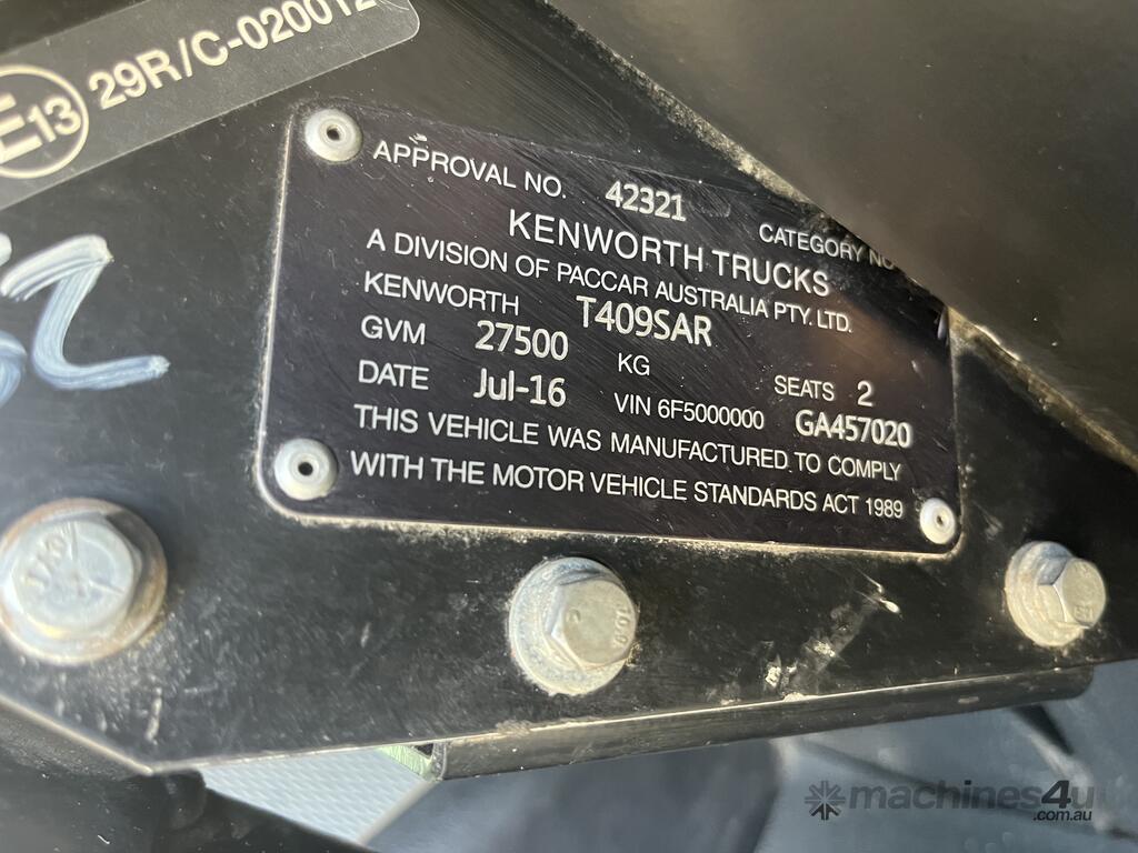 CP: 07/2016,Kenworth,T409SAR,Prime Mover Day Cab,Automatic,Airbag,Engine #: 79913667,Cummins ISX E5,6 Cyl,Diesel Turbo,477432 (Kms. Showing on Odometer),23679 (Hrs. Showing on Hour meter),Colour: White,Rego. No: NP(XB65PM), Unregistered NAT,VIN: 6F5000000GA457020,GVM: 27500,GCM: 97000,Sold with No Plates