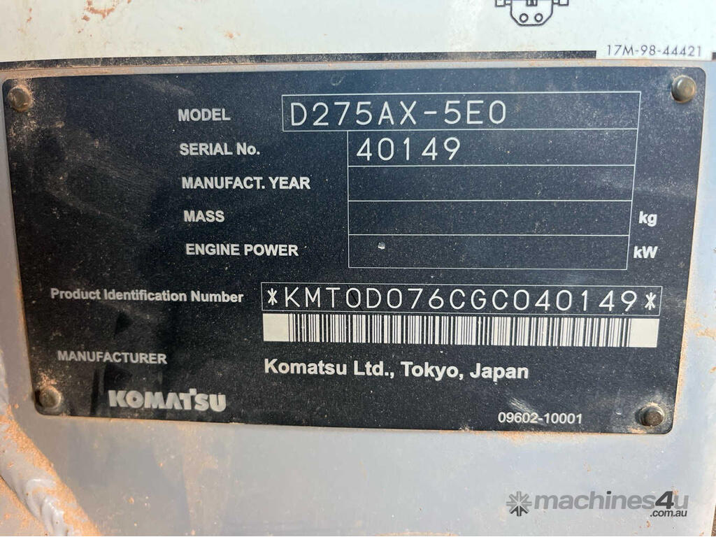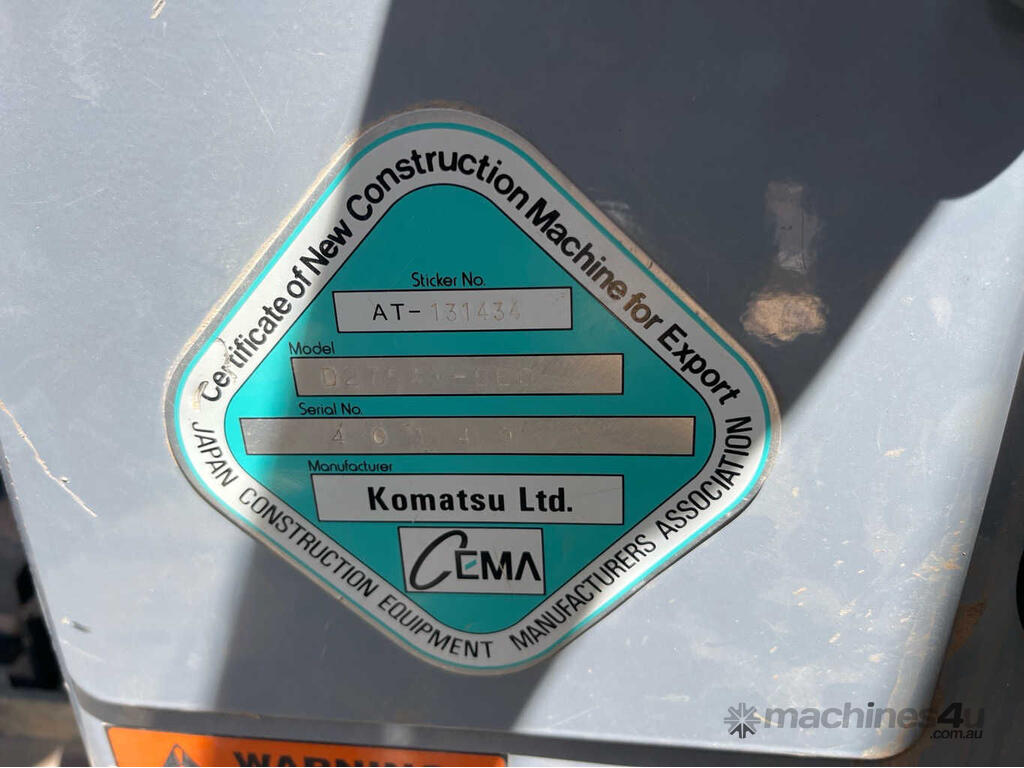 CP: CIRCA 2016,Komatsu,D275AX,Dozer (Steel Track),6 Cyl,Diesel Turbo,Odometer not visible,10087 (Hrs. Showing on Hour meter),Colour: Yellow,Rego. No: NP(48656C), Unregistered,Serial No: KMT0D076CGC040149,Sold with No Plates