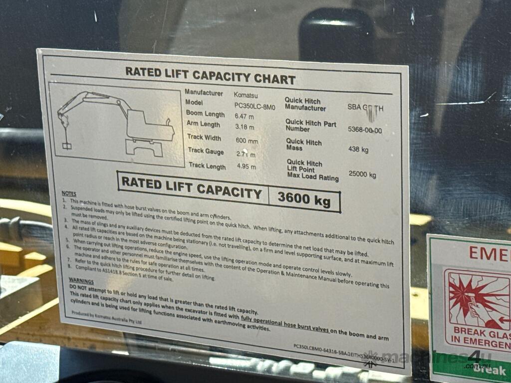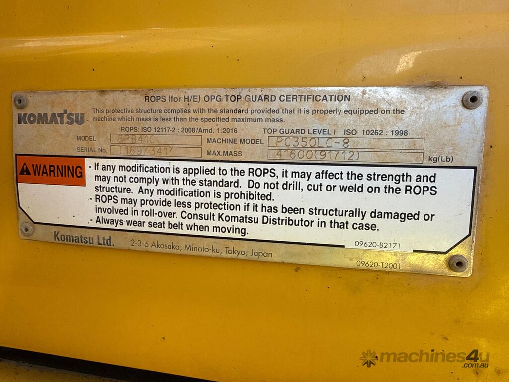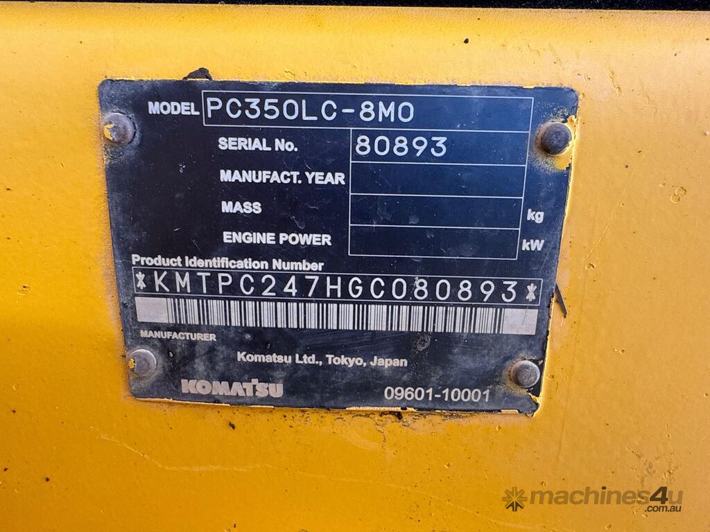 CP: CIRCA 2016,Komatsu,PC350LC-8,Excavator (Steel Tracked),Engine #: 26872869,6 Cyl,Diesel,Turbo,Odometer not visible,9813 (Hrs. Showing on Hour meter),Colour: Yellow,Unregistered,Serial No: KMTPC247HGC080893,ROPS No: undefined,Sold with No Plates