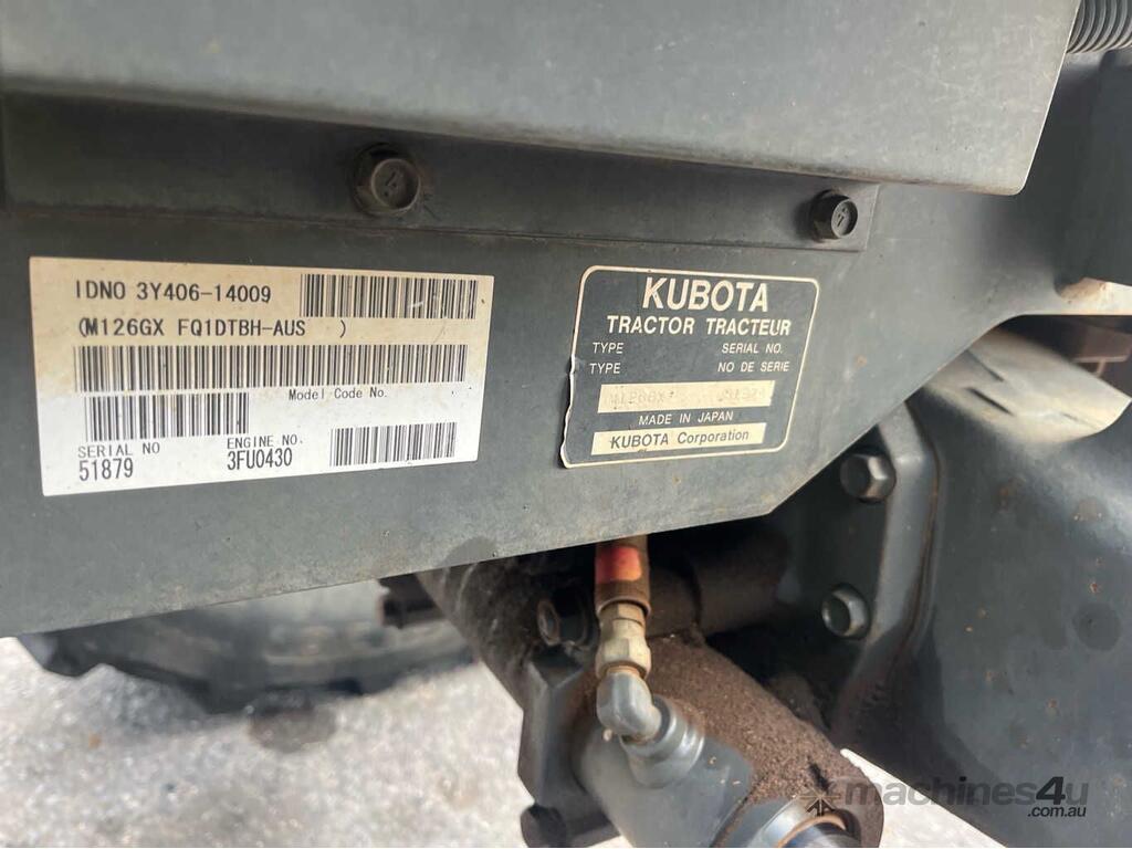 CP: CIRCA 2016,Kubota,M126GX,Tractor 4 x 4,Engine #: 3FU0430,6.1 Ltr,4 Cyl,Diesel Turbo,Odometer not visible,6081 (Hrs. Showing on Hour meter),Colour: Orange,Rego. No: NP(S75SCB), Unregistered SA,Serial No: 51879,Sold with No Plates,Key No: P16