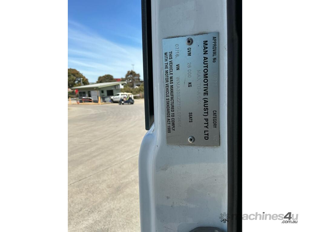 CP: 07/2016,MAN,TGS 26.440,Prime Mover Sleeper Cab,Automatic,Airbag Suspension,6 Cyl,Diesel,554377 (Kms. Showing on Odometer),18862 (Hrs. Showing on Hour meter),Colour: White,Rego. No: NP(1HJ2KE), Unregistered,VIN: WMA30SZZ7GL072464,Key No: 292,GVM: 26000,GCM: 68500,Sold with No Plates,Key No: 292