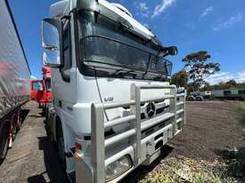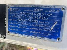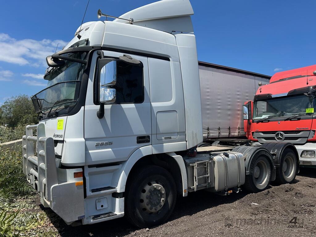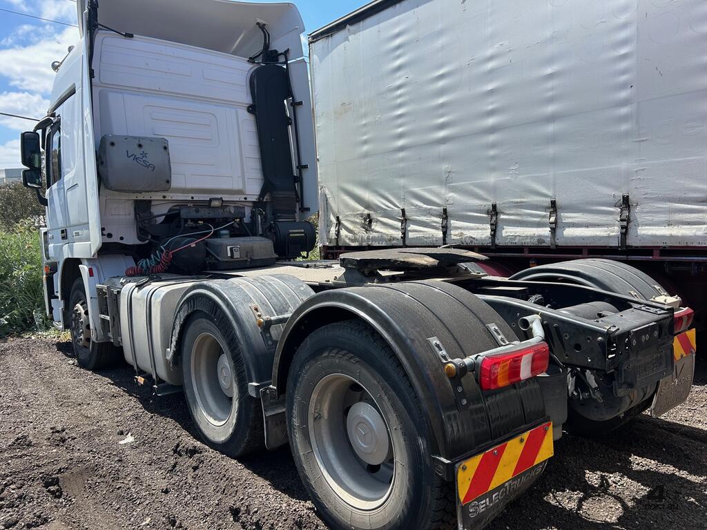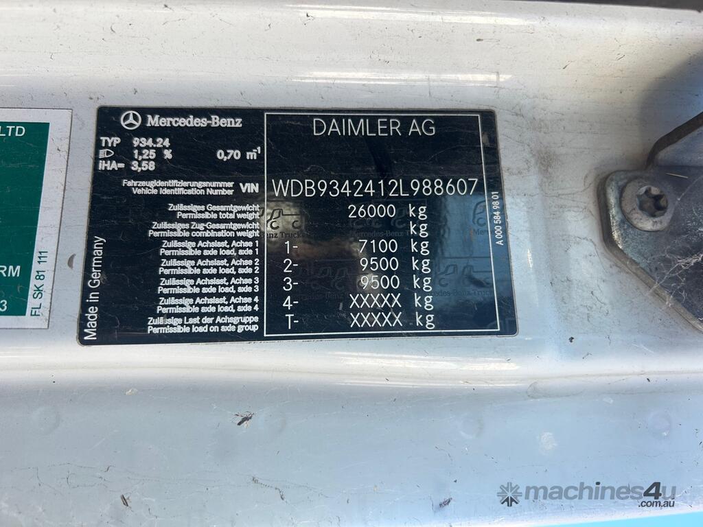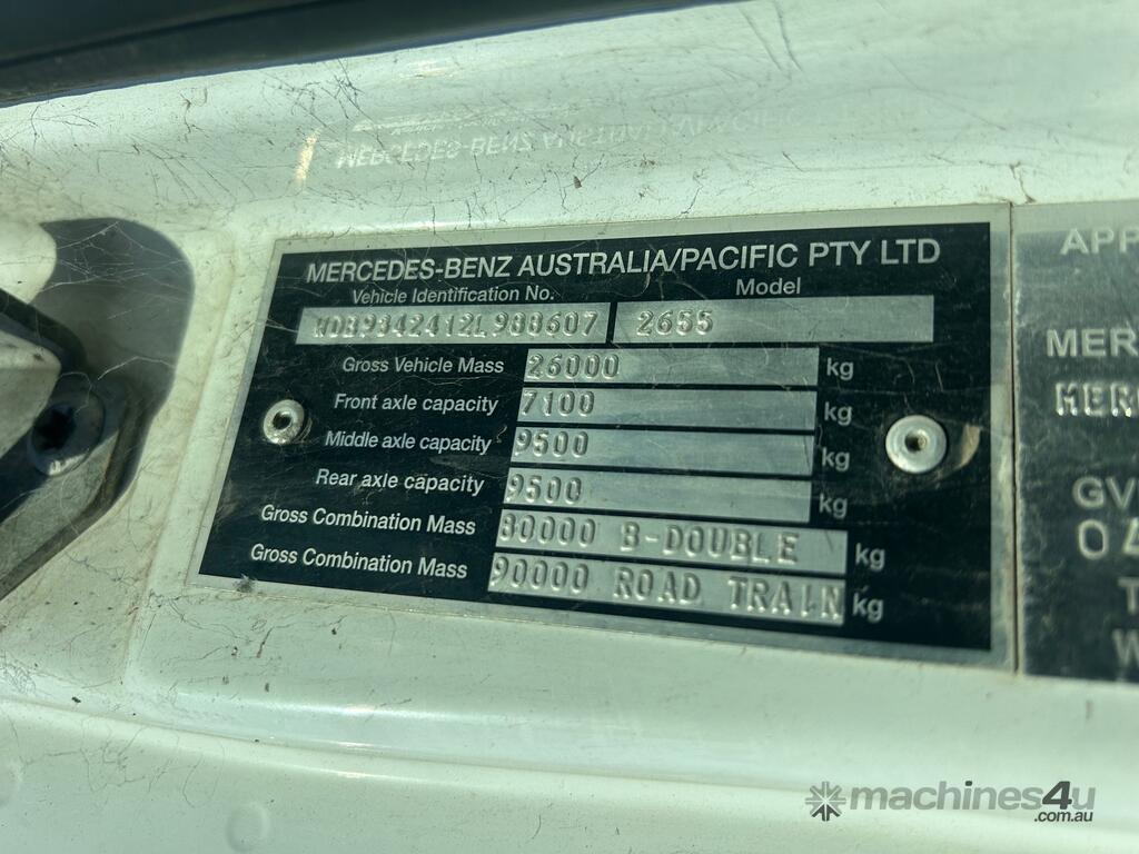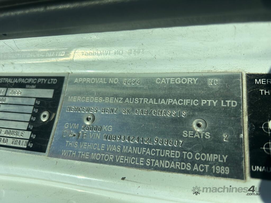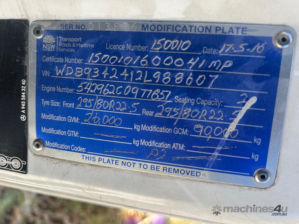 4/2016 Mercedes Benz Actros 2655 SK 6x4 cab chassis prime mover, 550HP V8 diesel engine, 12 speed automatic transmission, air bag suspension, full electrics, sleeper , sliding drawer cooler, Viesa cooling system, radio, CB radio, 1 x key. KLM: 920666 ( showing ) VIN: WDB9342412L988607 ENG: 542962C0977851 GVM: 26000KG GCM: 80000KG ( B Double ) GCM: 90000KG ( road train ) PLEASE NOTE: Possible fuel delivery issues as vehicle will start with Aerostart however will not idle on its own. Located in Laverton North. This vehicle will be sold without plates and not registered.