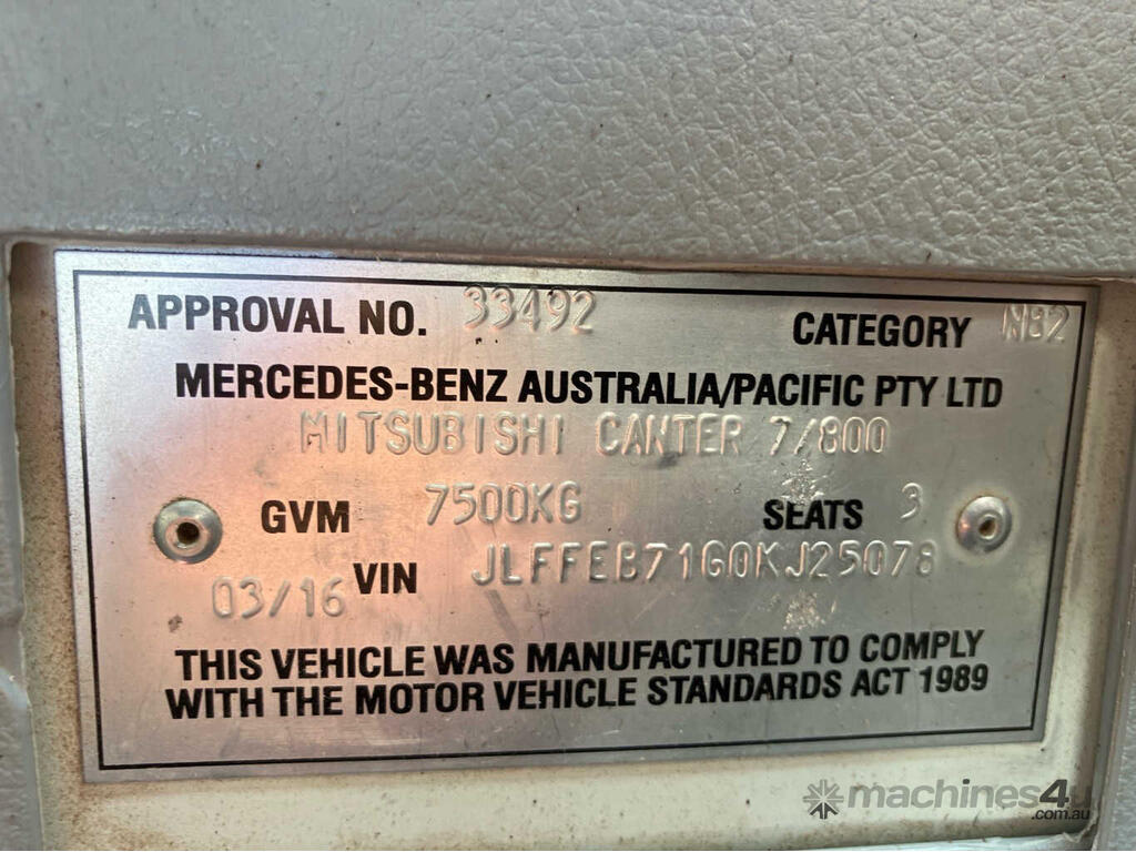 CP: 03/2016,Mitsubishi,Canter 7/800,Tipper,Manual,Leaf Spring Suspension ,Engine #: 4P10CC2709,4 Cyl,Diesel,5 Gears,62236 (Kms. Showing on Odometer),Hourmeter not visible,Colour: White,Rego. No: NP(1HI6XG), Unregistered VIC,VIN: JLFFEB71G0KJ25078,Key No: 31,Length: 6.4 m,GVM: 7500,GCM: 11000,Sold with No Plates,Key No: 31