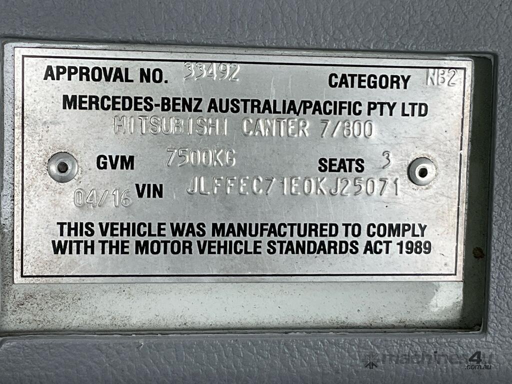CP: 04/2016,Mitsubishi Fuso,Canter 815,Tipper Day Cab,Manual,Spring ,Engine #: 4P10C02458,4 Cyl,Diesel Turbo,5 Gears,82600 (Kms. Showing on Odometer),Hourmeter not visible,Colour: White,Rego. No: CH99SJ NSW,Rego expiry: 01/09/2026,VIN: JLFFEC71E0KJ25071,Key No: 36E,Length: 6.2 m,GVM: 7500,GCM: 11000,Sold with No Plates,Key No: 36E