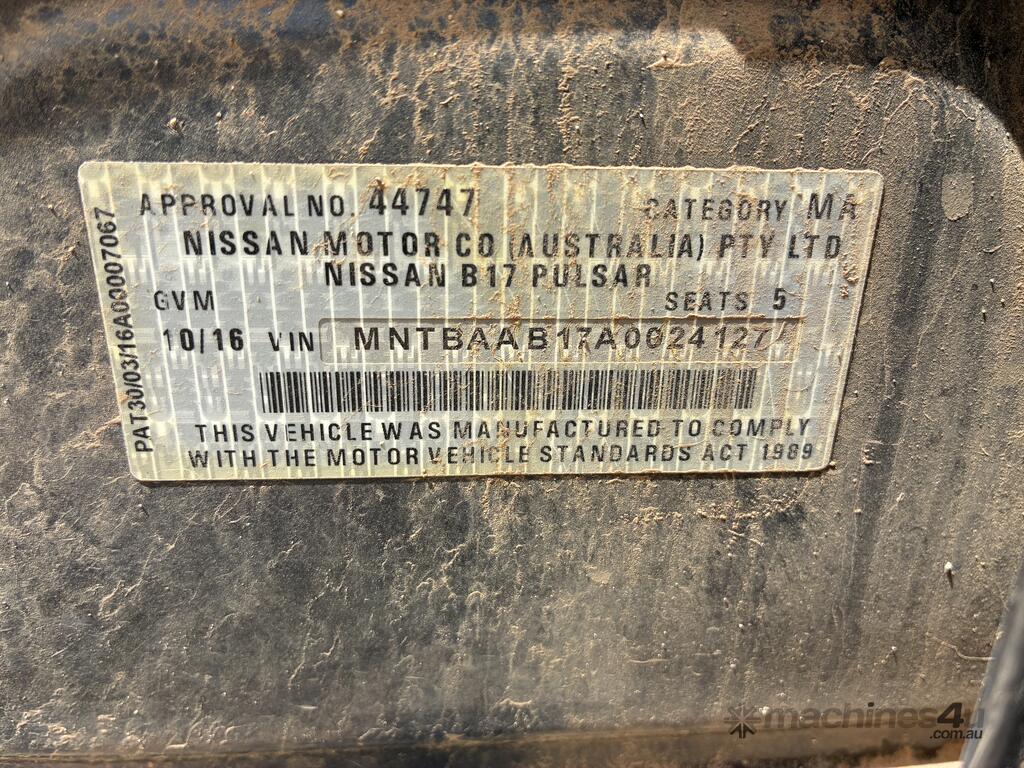 CP: 10/2016,Nissan,Pulsar,B17 Series 2 ST,Sedan,4 doors,Constantly Variable Transmission,Engine #: 359154R,1.8 Ltr,4 Cyl,Petrol - Unleaded ULP,Multi-Point Injection,1 Gears,Odometer not visible,Colour: Grey,Unregistered QLD,VIN: MNTBAAB17A0024127,Sold with No Plates,Incident Type: Impact