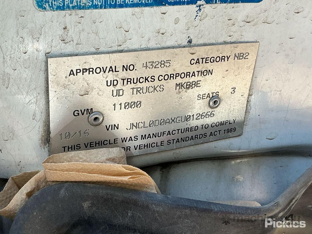 CP: 10/2016,Nissan UD,MK 11 250,Tautliner,Leafspring,6 Cyl,Diesel Turbo,Odometer not visible,Hourmeter not visible,Colour: White,Rego. No: NP(1ILY022), Unregistered WA,VIN: JNCL0D0AXGU012666,GVM: 11000,Sold with No Plates,WOVR Status: WOVR N/A,Incident Type: Impact