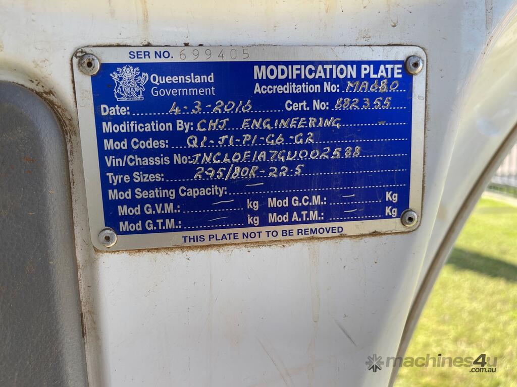 CP: 01/2016,Built: 01/2016,Nissan UD,PK 17 280 Condor,Crane Tipper,Automatic,Airbag,Engine #: 209709,UD GH7 280 EU V,6 Cyl,Diesel,6 Gears,136782 (Kms. Showing on Odometer),Hourmeter not visible,Colour: White,Rego. No: NP(851WEZ), Unregistered QLD,VIN: JNCL0F1A7GU002588,Key No: T12,Length: 8.9 M,GVM: 16500,GCM: 32000,Sold with No Plates,Key No: T12