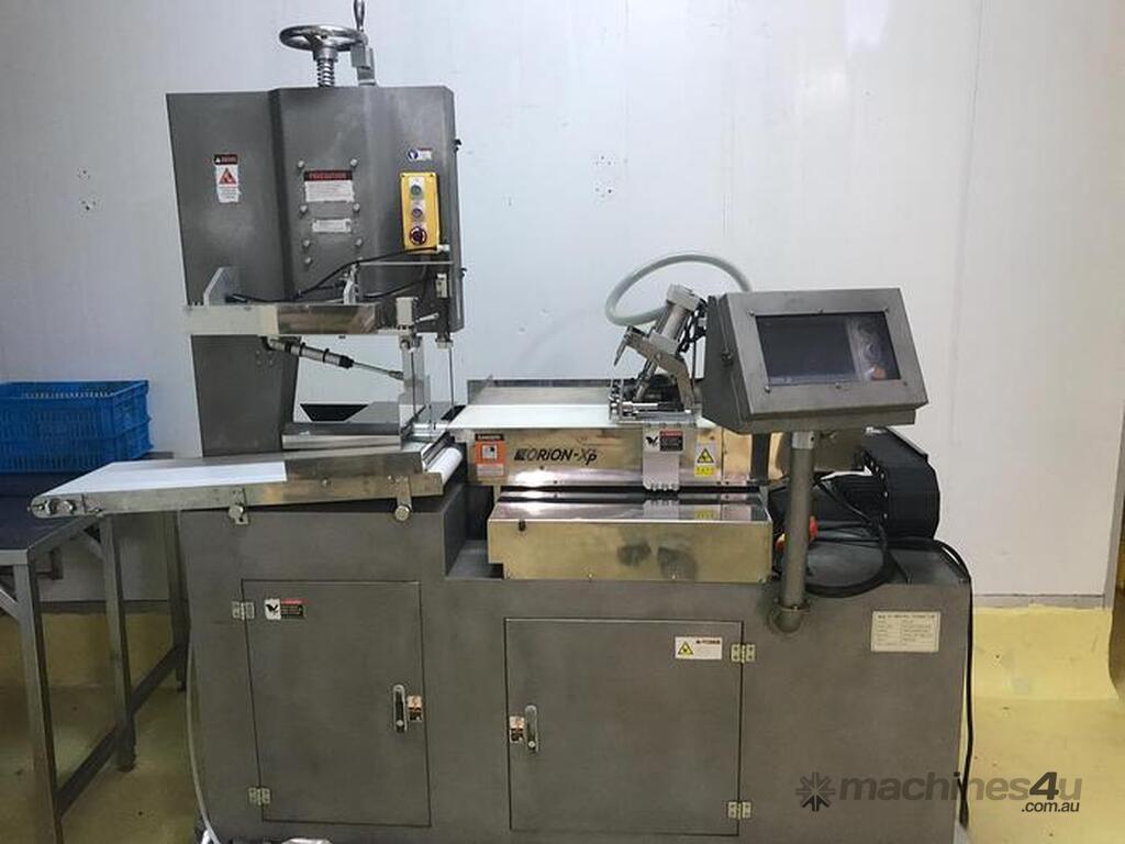 The ORION XP SRS-300 is a fully automated, high-speed band saw designed for cutting frozen beef ribs, bone-in meat, and frozen tuna. With minimal human interaction, it ensures safety, efficiency, and uniform slice thickness, making it ideal for high-volume meat processing. The machine has only 50 hours of use and is in excellent condition.