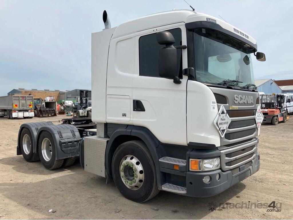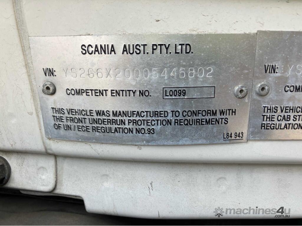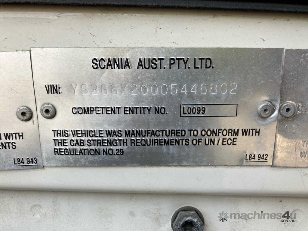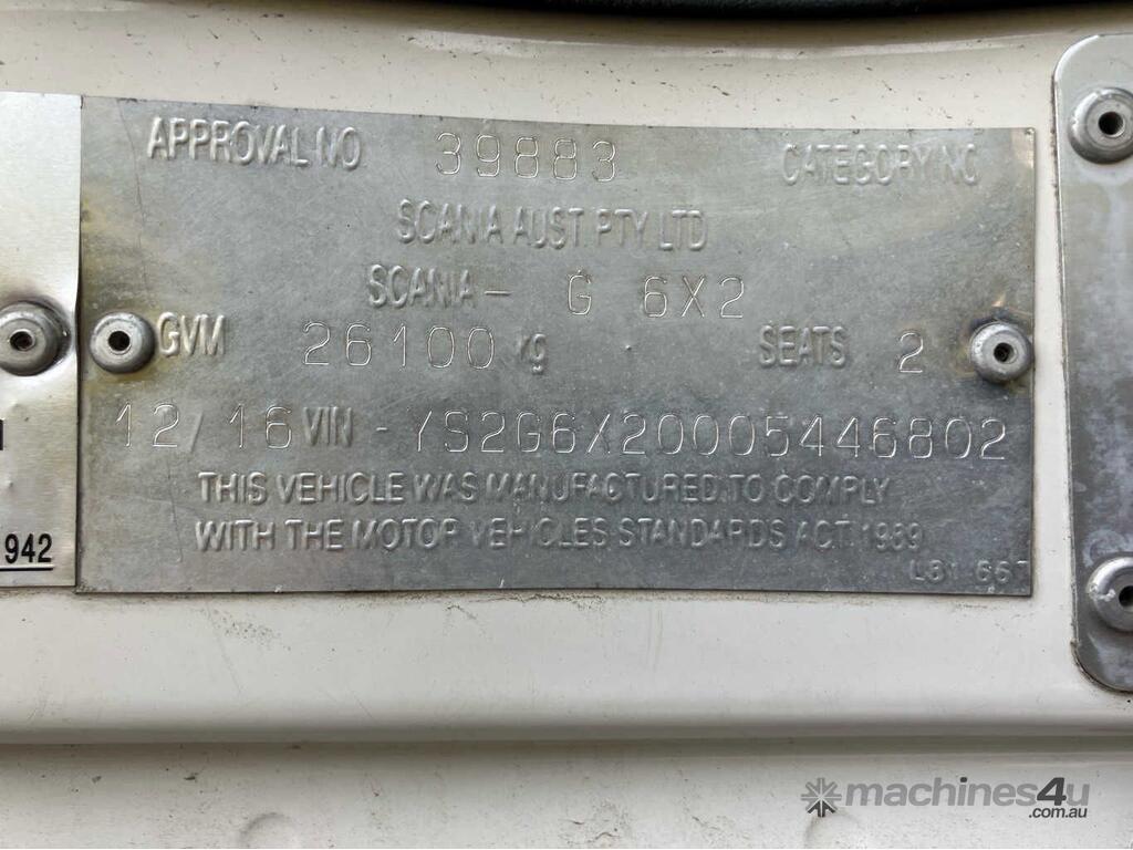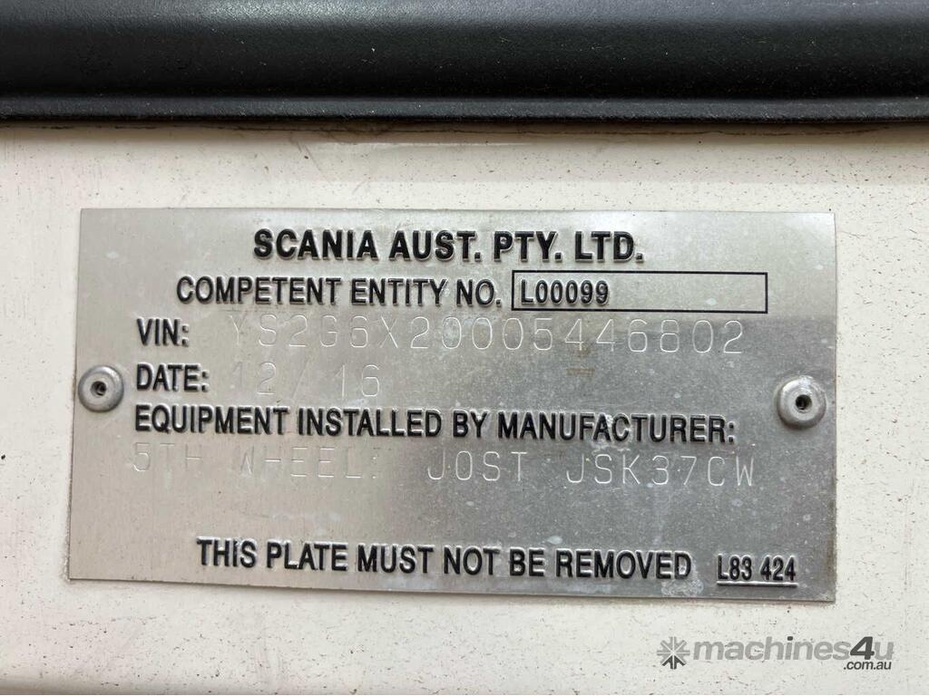 CP: 12/2016,Scania,G440,Prime Mover,Automatic,Airbag,6 Cyl,Diesel Turbo,599393 (Kms. Showing on Odometer),Hourmeter not visible,Colour: White,Unregistered,VIN: YS2G6X2,Length: 6.7 m,GVM: 26100,Sold with No Plates