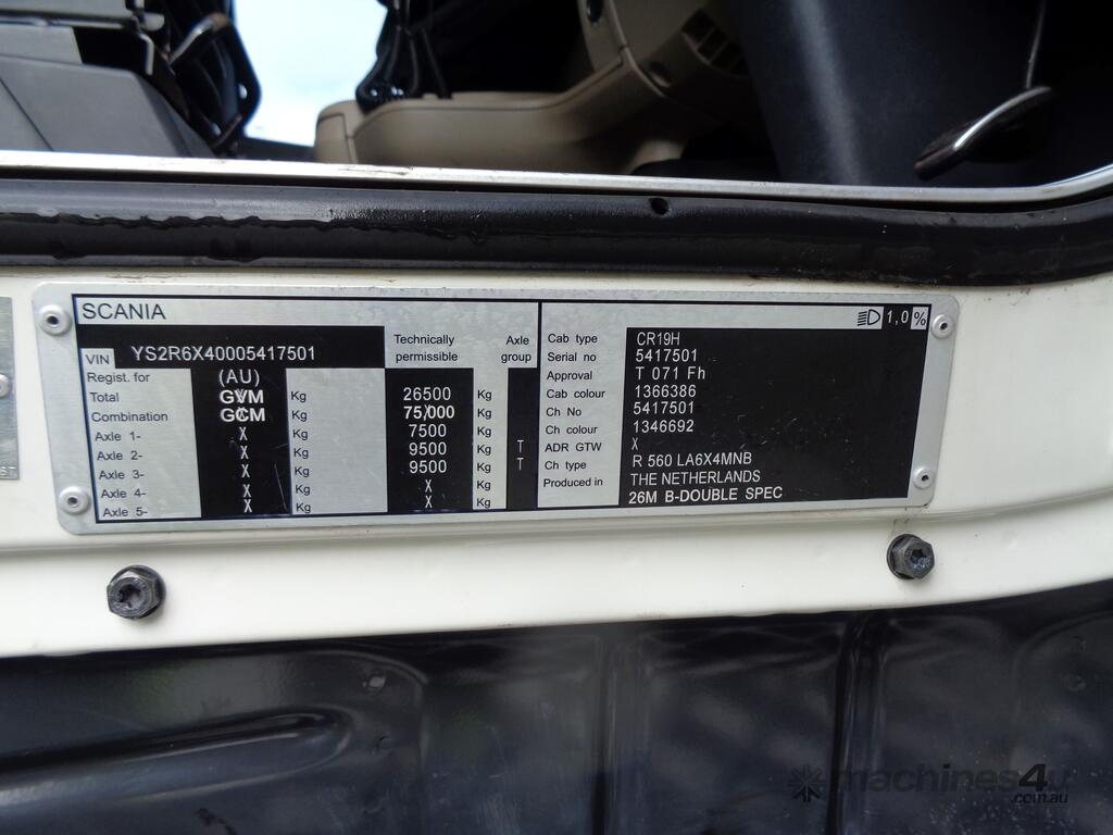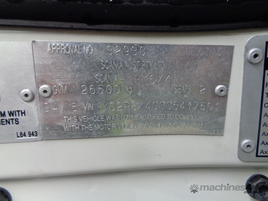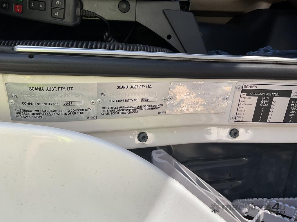CP: 04/2016,Scania,R560,Prime Mover,Automatic,Airbag Suspension,965166 (Kms. Showing on Odometer),Hourmeter not visible,Colour: White,Unregistered,VIN: VS2R6X1,GVM: 26500,GCM: 75000,Sold with No Plates